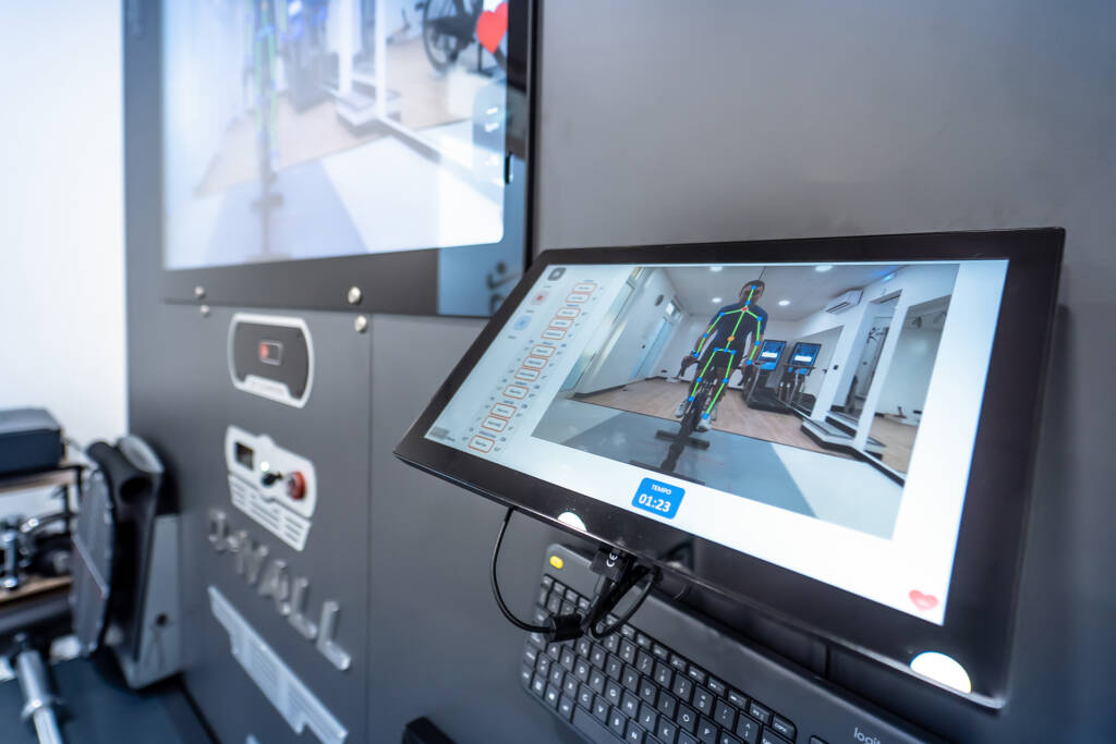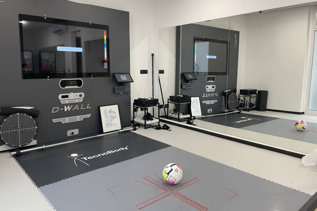 D-WALL è uno “specchio digitale” fornito di una telecamera 3D ed una piattaforma di analisi dell’appoggio ed è in grado di riconoscere in tempo reale fino a 16 articolazioni del corpo e ogni movimento effettuato nell’area operativa.